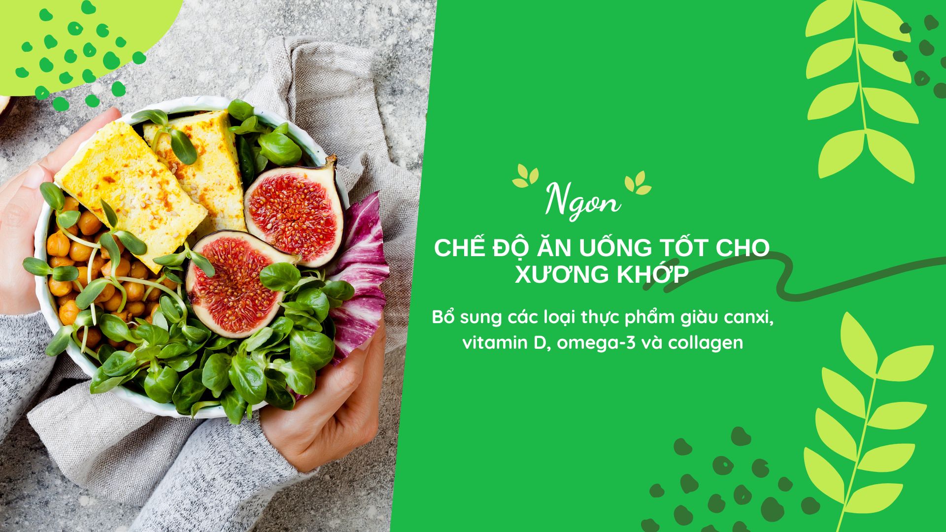 Chế độ ăn uống đóng vai trò quan trọng trong việc bảo vệ và duy trì sức khỏe xương khớp. Việc bổ sung các loại thực phẩm giàu canxi, vitamin D, omega-3collagen sẽ giúp tăng cường độ chắc khỏe cho xương, đồng thời giảm thiểu các triệu chứng đau nhức xương khớp.