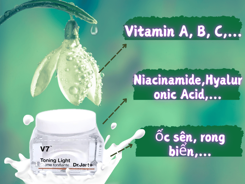 Kem dưỡng da V7 Dr.Jart+ với các thành phần từ thiên nhiên, lành tính, không nằm trong 2.000 chất có hại cho da, gồm các thành phần: