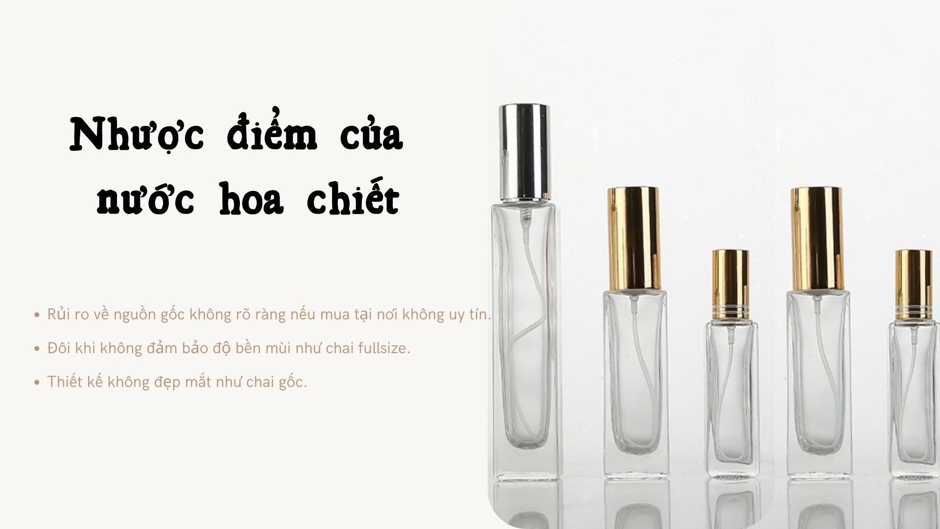 Mặc dù có nhiều ưu điểm, nhưng nước hoa chiết cũng tồn tại một số nhược điểm cần lưu ý. Một trong những vấn đề lớn nhất là rủi ro về nguồn gốc sản phẩm. Nếu bạn mua nước hoa chiết tại những cửa hàng không uy tín, có thể gặp phải hàng giả hoặc hàng kém chất lượng, ảnh hưởng đến trải nghiệm sử dụng.