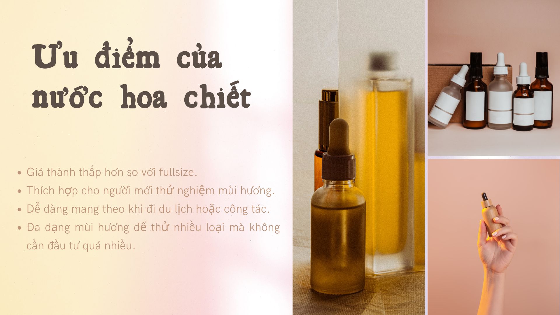 Với những ưu điểm như giá thành hợp lý, dễ dàng mang theo và đa dạng mùi hương để thử nghiệm, nước hoa chiết là một lựa chọn hấp dẫn cho những ai muốn trải nghiệm nhiều mùi hương mà không phải chi tiêu quá nhiều. Tuy nhiên, bạn cũng cần lưu ý đến các nhược điểm như rủi ro về nguồn gốc và khả năng bền mùi không bằng chai fullsize.
