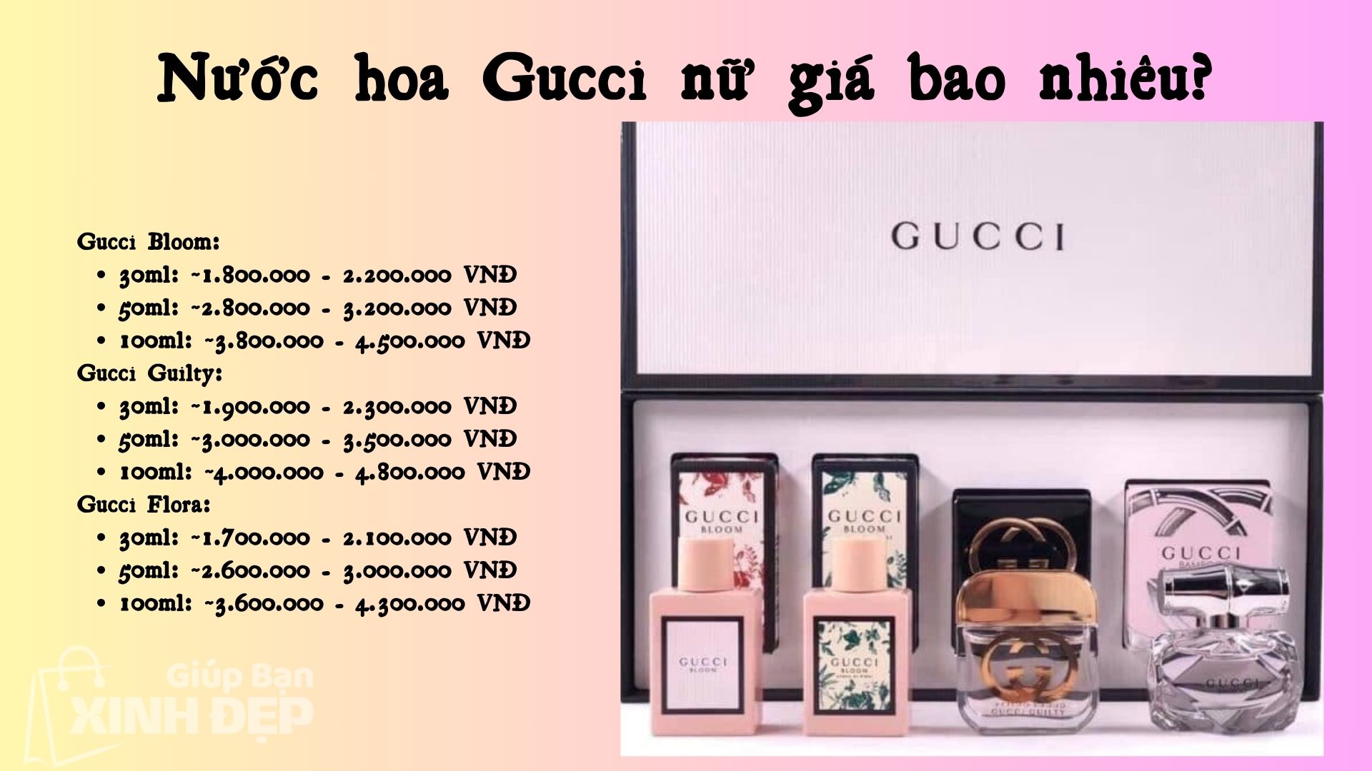 Giá nước hoa Gucci nữ chính hãng thường dao động tùy thuộc vào dòng sản phẩm, dung tích và nơi bán. Dưới đây là thông tin chi tiết để bạn tham khảo: