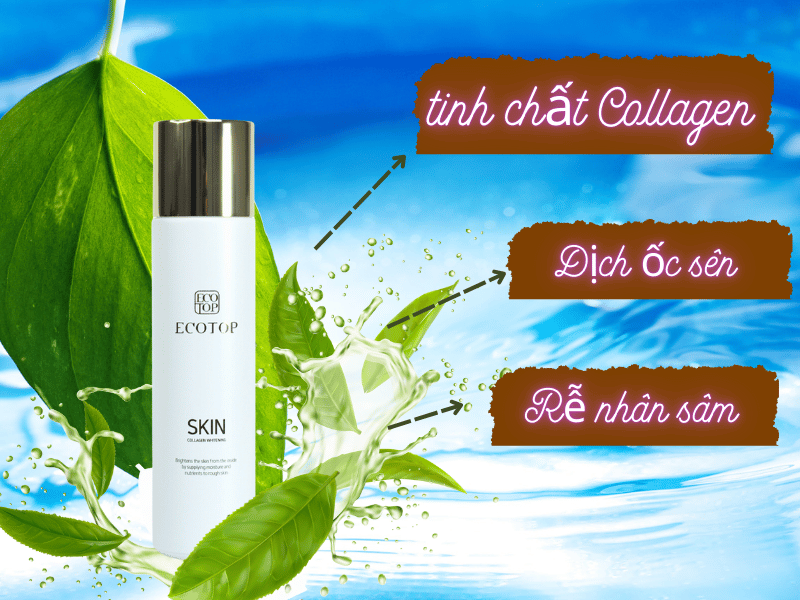 Nước Hoa Hồng Dưỡng Trắng Da ECOTOP giúp mịn da, dễ thẩm thấu serum hơn, với collagen đẩy lùi tình trạng lão hóa da xảy ra, dịch ốc sên bảo vệ da khỏi các tác nhân vi khuẩn bên ngoài, Chiết xuất rễ nhân sâm có công dụng cung cấp độ ẩm cho da, tăng độ đàn hồi da đồng thời nuôi dưỡng làn da trắng sáng, mịn màng.