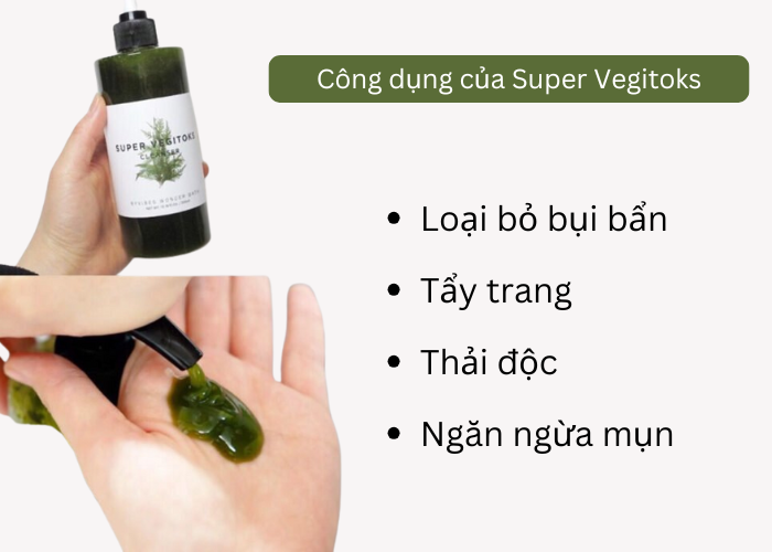 Thải độc: nhờ vào các thành phần chiết xuất từ thiên nhiên có trong Super Vegitoks giúp trung hoà với các tác nhân gây hại từ môi trường, loại bỏ độc tố tích tụ lâu ngày trên da. Mang lại làn da khoẻ mạnh, sạch sẽ và tươi mới.